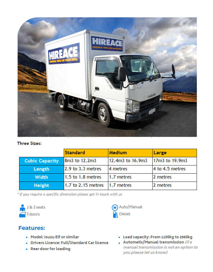 Hireace is a 100% Kiwi owned business, offering a diverse fleet of vehicles across 16 branches in New Zealand. Trucks, Vans, Minibuses, Utes and Trailers.